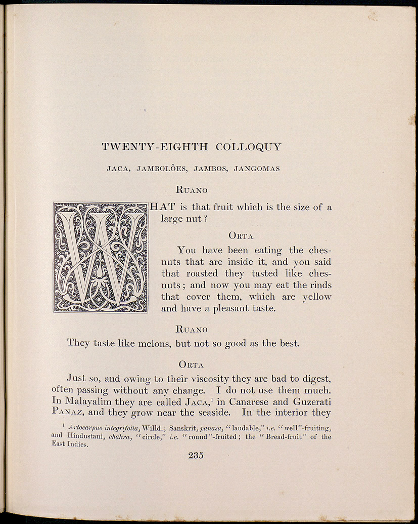 Obra ORTA, Garcia de - Colloquies on the simples & drugs of India, 1913. Cópia em JPEG Índice [Anterrosto] Seventh colloquy: altiht, anjuden, assafetida, dolce, odorata, anil Fifteenth colloquy: cinnamon Seventeenth colloquy: costo and the colerica passio Twenty-seventh colloquy: Two kinds of herbs for dysentery, and for another which cannot be touched without its withering Thirty-sixth colloquy: mungo, Melon of India and Water Melon Fifty-eighth colloquy: Treating of some things which came to the notice of the author and of medicines already discussed [...] The last colloquy: On betel and other things, in which some mistakes throughout the work are amended, which have been left through forgetfulness Index of persons chiefly authorities quoted, with titles of their works [Estampas] Plate I: Azuiar Plate II: Arbor Triste Plate III: Bangue Plate IV: Mançanas de la India Plate V: Calamo aromatico Plate VI: Canela Plate VII: Dela Datura Plate VIII: Elephante arrimado a la Palma Plate IX: Avellana Indica Plate X: Galanga Plate XI: Clavos Plate XII: Gengibre Plate XIII: Iaca Plate XIV: Nuez Moscada Plate XV: Macer Plate XVI: Mangas Plate XVII: Negundo (male) Plate XVIII: Negundo (female) Plate XIX: Palo de Culebra Plate XX: Pimienta Plate XXI: Palo de la China Plate XXII: Spodio Plate XXIII: Tamarindo | Índice > Twenty-eighth colloquy: jaca, jambolôes, jambos, jangomas > 235 |