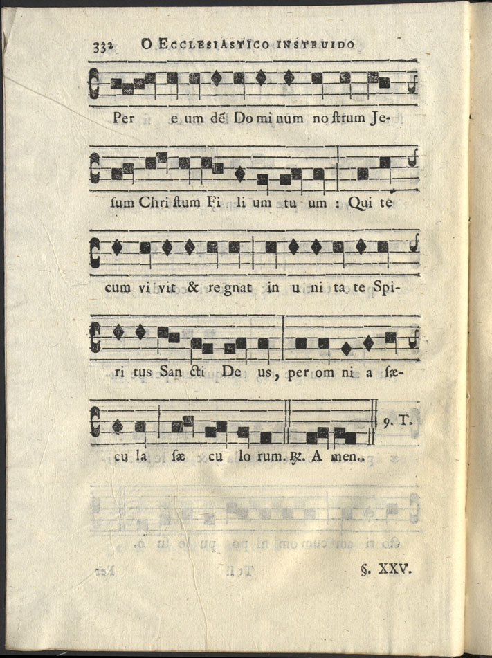 Obra O ecclesiastico instruido scientificamente na arte do canto-chaõ Cópia em JPEG Encadernação DigitalINDICE DOS LIVROS, CAPITULOS, PARAGRAFOS…LIVRO I. Da Theorica do Canto-chaõ. LIVRO II. Em que se poem huma instrucçaõ…conforme uso Romano. LIVRO III. Em que se poem vario Canto-chaõ pratico… O ECCLESIASTICO INSTRUIDO... NA ARTE DO CANTO-CHAÕ.LIVRO PRIMEIROCAPITULO I. Que cousa seja Musica. CAPITULO II. Em que se trata do Systema Musico. CAPITULO III. Em que se explica…em os tres generos. CAPITULO IV. Em que se explica…o genero Diatonico. CAPITULO V. Em que se explica as propriedades…Systema. CAPITULO VI. Em que se explica…conforme os modernos. CAPITULO VII. Em que se trata do Systema Musico… CAPITULO VIII. Em que se trata das Definições…da Musica. CAPITULO IX. Em que se trata da definição dos Signos…se cantaõ. CAPITULO X. Em que se trata das Propriedades, Cantorias,…e Deducções. CAPITULO XI. Em que se trata dos Signaes…no Canto-chaõ. CAPITULO XII. Em que se trata do modo de contar…e das Entoações. CAPITULO XIII. Em que se trata das Mutanças. CAPITULO XIV. Em que se trata das Entoações…dos modernos. CAPITULO XV. Em que se trata dos intervalos…se incluem. CAPITULO XVI. Em que se trata das proporções,…intervalos. CAPITULO XVII. Em que se trata do numero…em particular. CAPITULO XVIII. Em que se trata da variedade…em o Canto-chaõ. CAPITULO XIX. Em o qual se explica…effeitos dos doze tons. CAPITULO XX. Em que se trata…qualquer composiçaõ de Canto-chaõ. CAPITULO XXI. Em que se trata das Disjunctas. CAPITULO XXII. Em que se trata …ou divisaõ de tono. CAPITULO XXIII. Em que se trata do uso de b mol…casos particulares. CAPITULO XXIV. Em que se trata das entoações…no Canto-chaõ. CAPITULO XXV. Em que se trata do…qualquer Antiphona. CAPITULO XXVI. Em que se trata…os Introitos da Missa. CAPITULO XXVII. Em que se trta de todas as Clausulas…doze tons. CAPITULO XXVIII. Em que se trata da Corda choral. CAPITULO XXIX. Em que se trata do Compasso…do Canto-chaõ. CAPITULO XXX. Em o qual se poem…hum bom Cantor. LIVRO SEGUNDO, EM QUE SE POEM HUMA INSTRUCÇAÕ…I. Modo que se deve observar em cantar nas Matinas… II. Modo como se devem cantar todos…e dias feriaes. III. Modo como nas Matinas se devem cantar… IV. Modo como se canta…como nas Laudes. V. Modo como se deve levantar o Hymno… VI. Modo de cantar o Martyrologio. VII. Modo como na Completa…o Verso Deus in adjutorium. VIII. Modo de cantar as Prophecias. IX. Modo como se deve cantar a Epistola. X. Modo como se deve cantar…ao Diacono. XI. Modo de cantar o Ite Missa…festas solemnes. XII. Modo de cantar o Confiteor…Pontifical. XIII. Modo de cantar os Capitulos…ao Presbytero. XIV. Modo de cantar as Orações. XV. Modo de cantar as Orações simples…de todo o anno. XVI. De outro modo, ou tom ferial. XVII. Modo de levantar na Aspersaõ…e Vidi aquam. XVIII. Modo de levantar na Missa…in unum Deum. XIX. Modo de cantar na Missa os Prefacios. XX. Modo como na Sexta feira…que principiaõ todas:Oremus. XXI. Modo como se deve cantar…e semiduplices. XXII. Modo como se deve cantar a bençaõ de Pontifical. XXIII. Modo como se deve cantar a Paixão. XXIV. Modo como se deve cantar…do Cirio Paschal. XXV. Modo de cantar a bençaõ da Fonte no Sabbado Santo. XXVI. Modo como se deve cantar a Ladainha no Sabbado… APPENDIX, Em o qual se poem alguns Hymnos selectos… LIVRO TERCEIRO, EM QUE SE POEM VARIO CANTO-CHAÕ…NA QUARTA FEIRA DE CINZA. SEXTA FEIRA EM PARASCEVE. OFFICIO DA QUINTA FEIRA MAIOR. OFFICIO DA SEXTA FEIRA DE PARASCEVE. OFFICIO DO SABBADO SANTO. OFFICIO DO TRANSITO DO GLORIOSO PATRIARCA S.BENTO. OFFICIO DA TRASLADAÇAÕ DP GLORIOSO PATRIARCA S.BENTO. FESTA DO SS. NOME DE JESUS. FESTA DAS CINCO CHAGAS DE N.S.JESU CHRISTO. FESTA DE N. SENHORA DO DESTERRO. FESTA DE S. THEOTONIO CONFESSOR. FESTA DE S. JOSEPH ESPOSO DA B. V. MARIA. FESTA DA SENHORA DAS DORES. FESTA DOS PRAZERES DA B. V. MARIA. FESTA DO SS. CORAÇAÕ DE N. S. JESU CHRISTO. FESTA DA METERNIDADE DA B. MARIA V. FESTA DE S. JOAÕ DAMASCENO. FESTA DOS CINCO MARTYRES DE MARROCOS. FESTA DE SANTO ANTONIO DE PADUA. FESTA DE S. LUIZ GONZAGA CONFESSOR. FESTA DA PUREZA DA B. VIRGEM MARIA. FESTA DOS SANTOS ANJOS CUSTODIOS. FESTA DOS ARCHANJOS S. RAFAEL. FESTA DOS ARCHANJOS S. GABRIEL. FESTA DE S. ISABEL RAINHA DE PORTUGAL. FESTA DE S. PULCHERIA VIRGEM IMPERATRIZ. FESTA DE S. CAMILLO DE LELLIS CONFESSOR. FESTA DO PATROCINIO DE S. JOSEPH. APPENDIX, EM O QUAL SE POEM OS PSALMOS, E LIÇÕES… PSALMOS, E LIÇÕES DA QUINTA FEIRA MAIOR. PSALMOS, E LIÇÕES DA SEXTA FEIRA em Parasceve. PSALMOS, E LIÇÕES DO SABBADO SANTO. PSALMOS, E ORAÇÕES DAS VESPERAS do Officio dos Defuntos. PSALMOS, E LIÇÕES DAS MATINAS do Officio dos Defuntos. | Encadernação Digital > O ECCLESIASTICO INSTRUIDO... NA ARTE DO CANTO-CHAÕ. > LIVRO SEGUNDO, EM QUE SE POEM HUMA INSTRUCÇAÕ… > XXIV. Modo como se deve cantar…do Cirio Paschal. > 332 Tipo:image/jpeg Tamanho:196 KB Cor:24 bpp