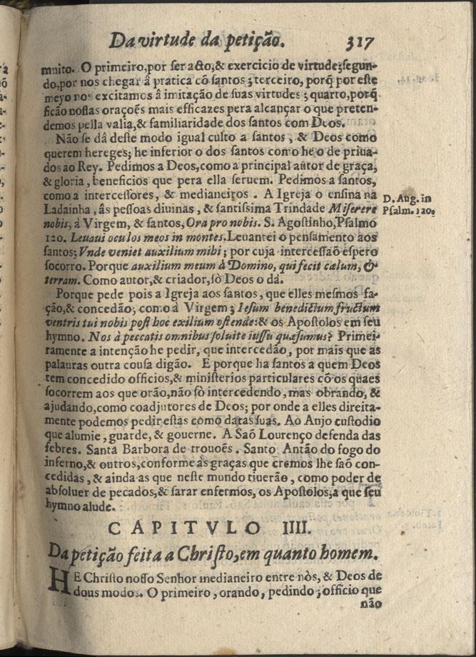 Obra MONTEIRO, Diogo, S.J., 1562-1634 - Arte de orar, 1630. Cópia em JPEG ÍndiceIndice dos capitvlos, e divisam deste Liuro Tratado primeiro: Da Oração em geral Tratado II. Do Autor, e doutrina q[ue] principalme[n]te seguiremos nesta obra Tratado III. Das potencias, e affeitos de nossa alma Tratado IIII. Das virtudes Theologaes, Fè, Esperança, e Charidade Tratado V. Da virtude da Prudencia Tratado VI. Da virtude da Iustiça Tratado VII. Da virtude da Fortaleza Tratado VIII. Da virtude da Temperança Tratado IX. Dos Doe[n]s do Spirito Santo, e graças gratisdatas Tratado X. Do que se acha no liuro dos exercicios, acerca das virtudes, e vicios de que atequi tratàmos Tratado XI. Dos tres estados, que se achão nas virtudes, de que atequi se tratou, e na perfeição Tratado XII. Da virtude da Religião Tratado XIII. Da difinição, e diuisaõ da oração mental em geral Tratado XIIII. Da Meditação Tratado XV. Em que se mostrão os doze tesouros, e arte de meditar do liuro dos exercicios Tratado XVI. Dos tres modos de orar Tratado XVII. Dos aparelhos pera a oração, e meditação Tratado XVIII. Da virtude da Petição Tratado XIX. Da virtude da obsecraçaõ Tratado XX. Da virtvde de insinuação Tratado XXI. Da acção de Graças Tratado XXII. Da Adoração Tratado XXIII. Da virtude do louuor Tratado XXIIII. Do acto do Canto, oitaua especie da virtude da religião Tratado XXV. Do Sacrificio, e oblação. Nona especie, ou acto da virtude da Religião Tratado XXVI. Da decima especie da virtude da Religião, que he voto Tratado XXVII. Das especies 11. 12. 13. 14. da virtude da Religião, que saõ Iuramento, Adiuração, Culto de Sacramentos, e Sacramentaes Tratado XXVIII. Da virtude da Religião, que he Deuação Tratado Vltimo da Contemplação Do methodo de fazer confissam dos pecados Indice das materias e covsas mais principaes [...] | Índice > Tratado XVIII. Da virtude da Petição > 317 Tipo:image/jpeg Tamanho:226 KB Cor:24 bpp