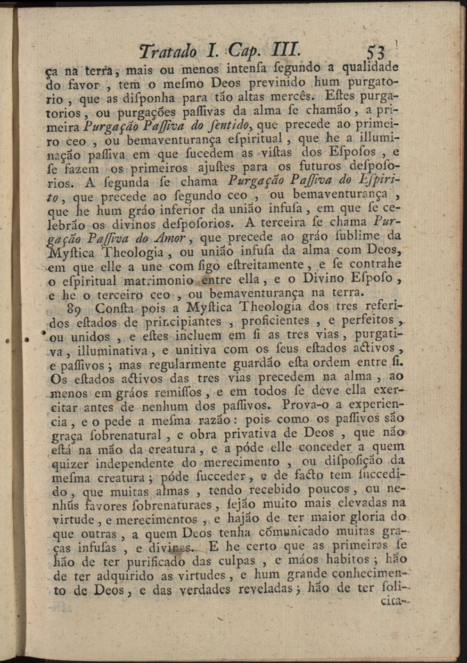 Obra CONCEIÇÃO, Francisco da, O.F.M., fl. 1779 - Director instruido …, 1779. Cópia em JPEG Índice Introducção persuasiva á vida do espirito Tratado primeiro. Da essencia, partes, e ordem dos estados da Mystica Theologia, e da differença da vida Activa, e Contemplativa Tratado segundo: da oração, e suas partes Tratado terceiro: do estado de principiantes, ou via purgativa, e seus exercicios Capitulo II. Do composto Humano, e do seu modo de obrar, e da moralidade dos seus actos Capitulo IV. Do modo de purgar os appetites, payxões, e sentidos externos, e internos Capitulo V. Do modo de purgar os peccados actuaes, e habituaes, e da guarda do coração Capitulo VII. Do meio, porque se faz a illuminação activa, que são as virtudes Capitulo X. Do exercicio da Presença de Deos, e oração de Recolhimento, de Quiete, e de Fé adquiridas Tratado quarto: do estado de aproveitados, ou Via illuminativa, e seus exercicios Capitulo II. Dos sinaes por onde se póde conhecer que Deos tem introduzido a alma ao estado de aproveitados [...] Capitulo IV. Dos instrumentos, com que se faz esta purgação passiva Capitulo X. Do Recolhimento, Quiete, e Oração de Fé infusas; e da Embriaguez sobrenatural, e Somno de potencias Capitulo XI. Declara-se em que consistão as Vistas dos Esposos; e da-se huma breve noticia das quatro Aguas, e sete Moradas de S. Theresa Tratado quinto: do estado de perfeitos, ou via unitiva, e seus exercicios Capitulo IV. Do caso que se deve fazer das visões, revelações, e locuções, e do modo de conhecer quaes são verdadeiras, ou falsas Capitulo V. Do Impulso divino, e do Extasis, e Rapto, ou Vôo do espirito Capitulo X. Da especial união d’algu[m]as almas perfeitissimas com Jesus Christo no Santissimo Sacramento da Eucharistia Capitulo XI. Dos exercicios da Via Unitiva, ou estado de perfeitos, e da ordem, e modo de os prescrever o Director Capitulo XII. de algu[m]as instrucções de S. João da Cruz mui uteis aos Directores Formulario pratico da oração mental, e mais exercicios devotos 350 I. Oração mental | Índice > Tratado primeiro. Da essencia, partes, e ordem dos estados da Mystica Theologia, e da differença da vida Activa, e Contemplativa > Capitulo III. Da Ordem dos estados das tres vias > 53 |